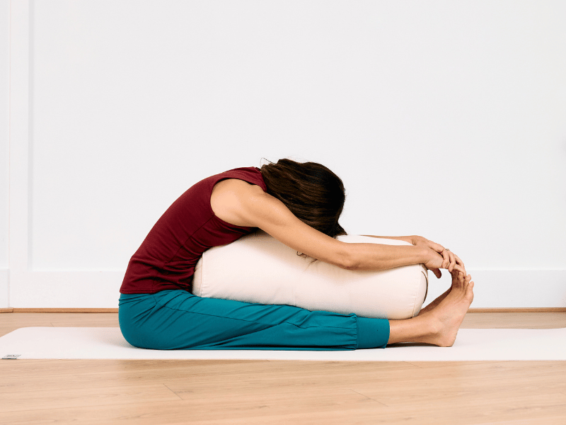 Sit with your legs outstretched in front of you and the bolster lying vertically along your legs. Slowly ease forwards, bringing your belly, front ribs and chest to rest against the bolster. Place your hands anywhere along the bolster that feels comfortable and relax here for 10-20 breaths.