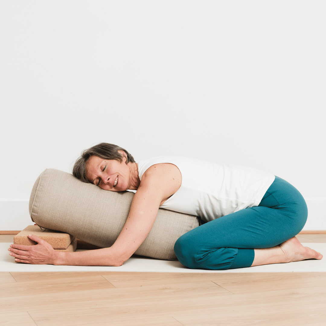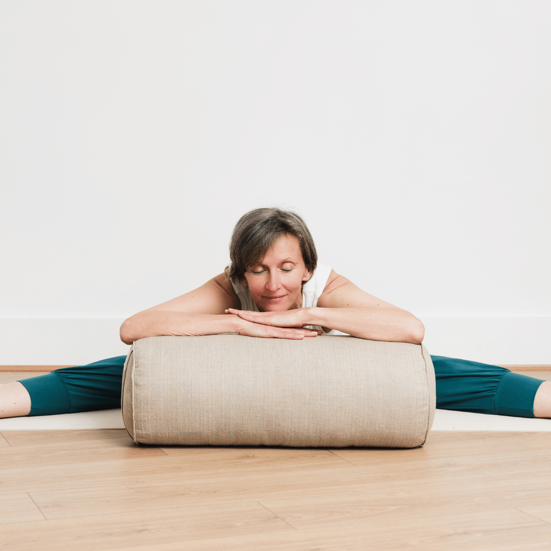 Letting the body surrender to gravity in Upavistha Konasana with a bolster is a wonderful way to let go.