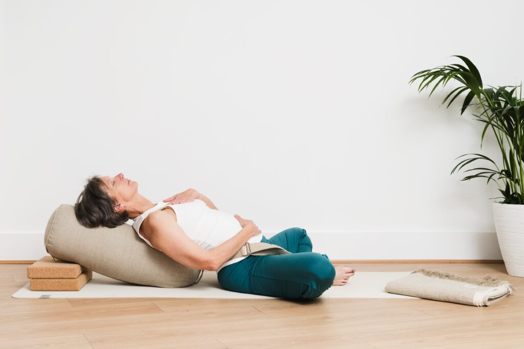 Softening and opening the body in Supta Baddha Konasana while focusing on the breath is a great way to promote deep relaxation.