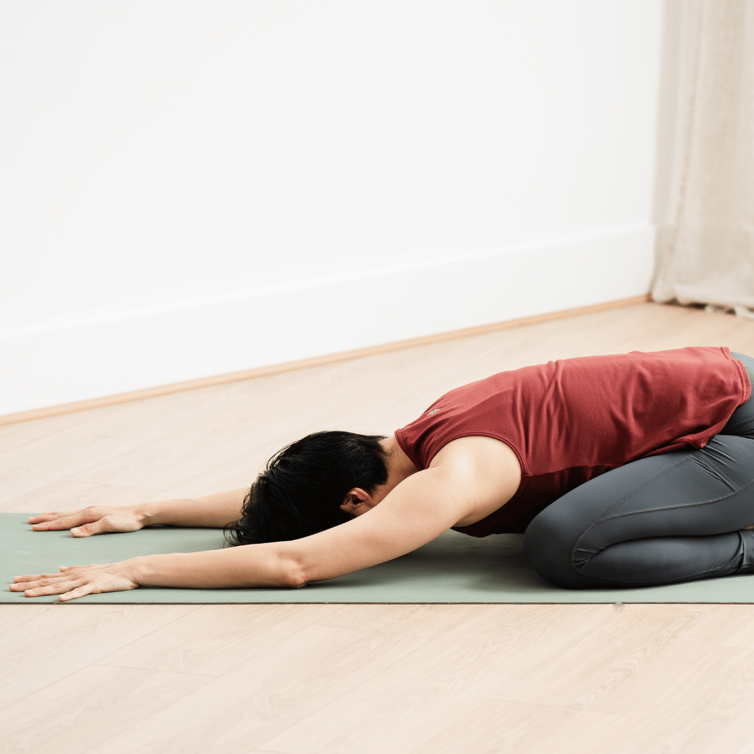 Bring the big toes to touch, knees wide and let your seat connect to your heels or a support (blanket, cushion, or block). Let the torso rest in between the thighs. Arms reach forward with the elbows and forearms resting on the floor. If possible have the space between the forehead rest onto the floor or a support. This can have a very calming effect on the mind.