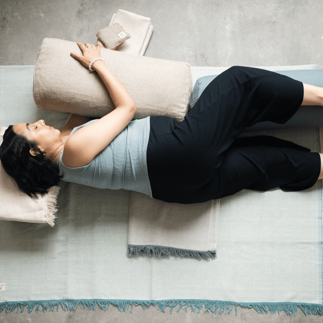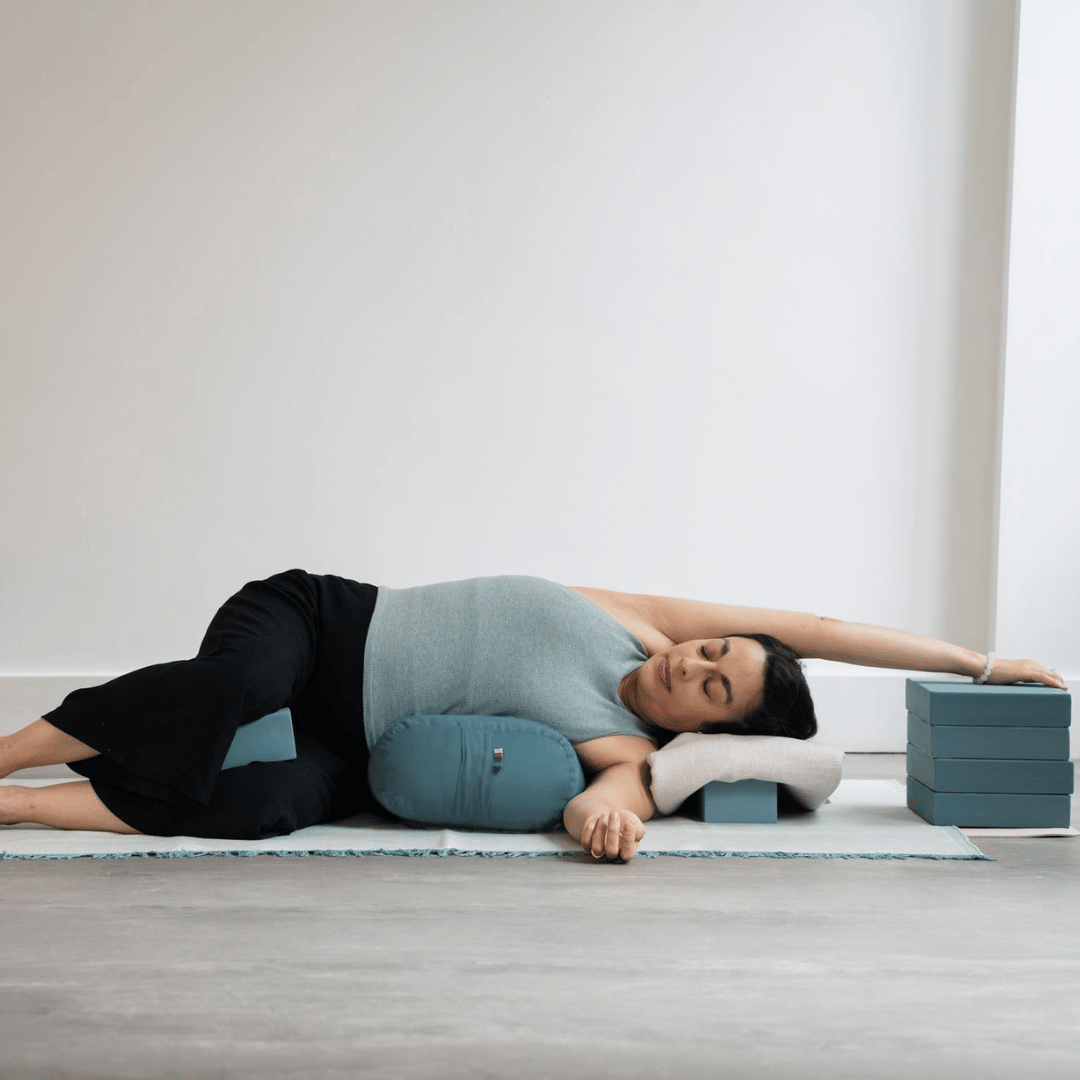 This quintessential restorative pose helps to support nervous system health and feels delicious during pregnancy! If you only have time for one pose in this sequence then try this one. The reclined nature of the posture creates space across the front body, including the chest, hips and belly. While this is quite prop heavy and takes a bit of time to set up, it’s definitely worth it. Remember that the act of self-care through restorative postures is about giving yourself the permission to slow down, soften and rest in order to replenish your energy. Growing a baby is hard work on the body so give yourself the gift of rest when you can.