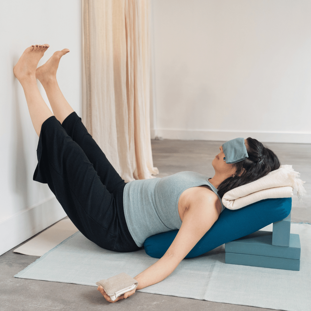 Props: 3 eye bags, 2 foam blocks, 1 brick, 1 bolster, 1 blanket, a wall space.