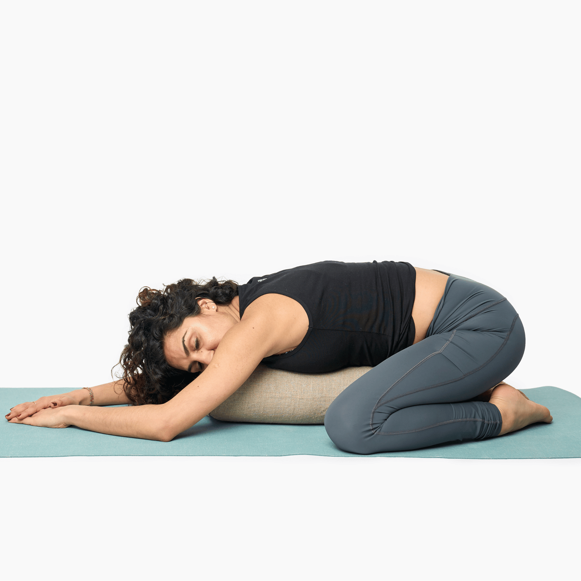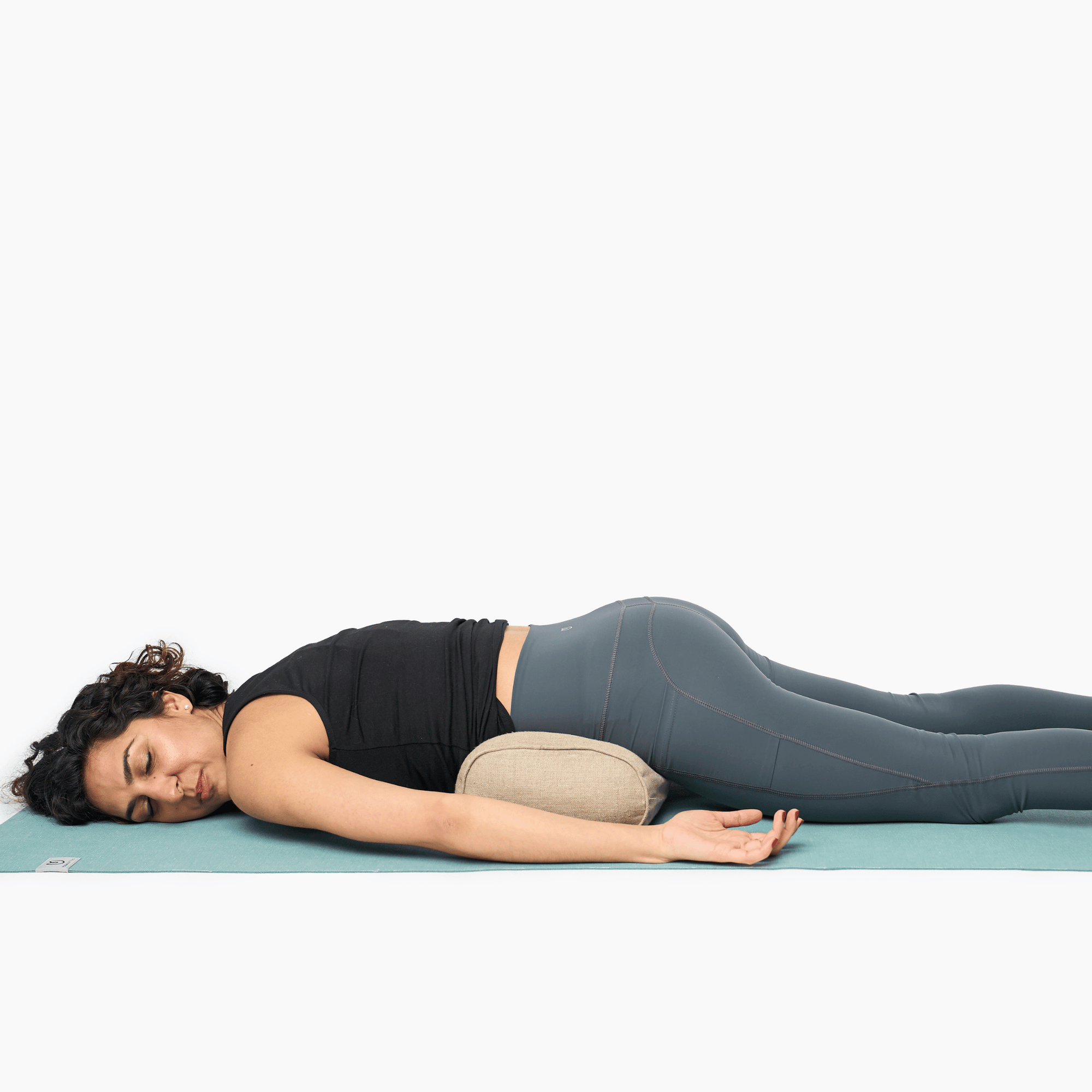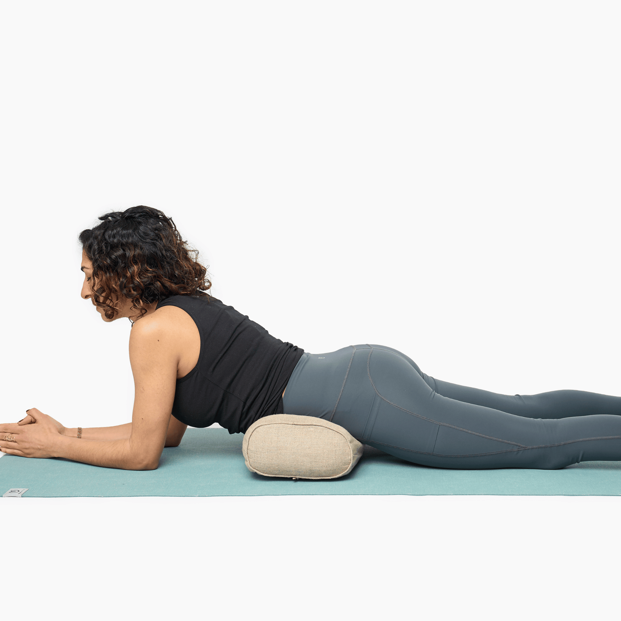 How to: Place the small rectangular bolster horizontally across the middle of your mat. Gently lay down and aim to rest your pelvis and lower belly onto the bolster. Prop your upper body up using your forearms and stay long through the spine. Stay here for as long as feels comfortable.