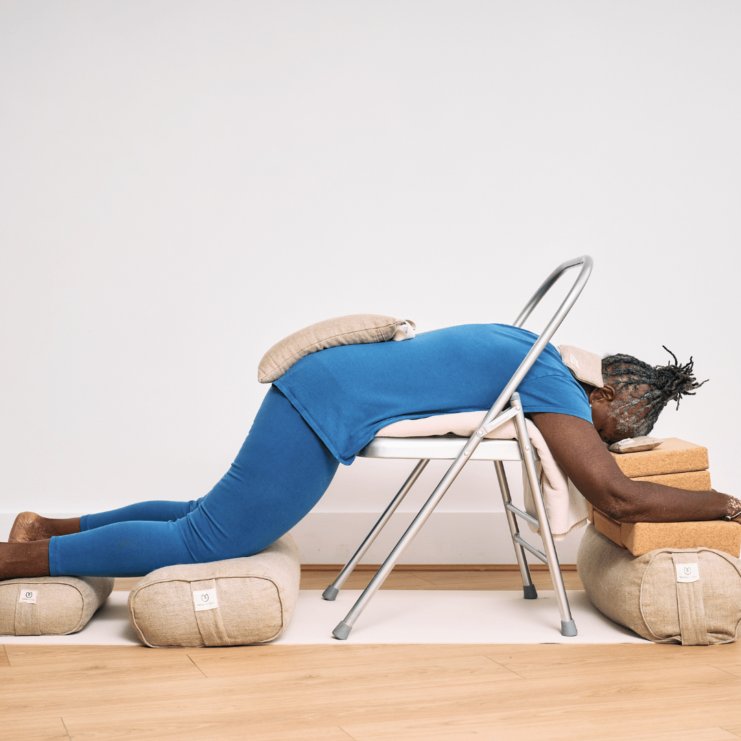 Place eye pillows where feels best and dissolve into this deeply healing posture that is calming and allows fuller breaths plus the angle of thighs and pelvis allow for tension to be released and move deeper into relaxation.