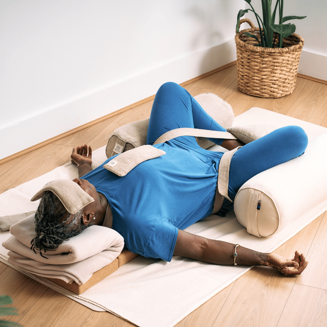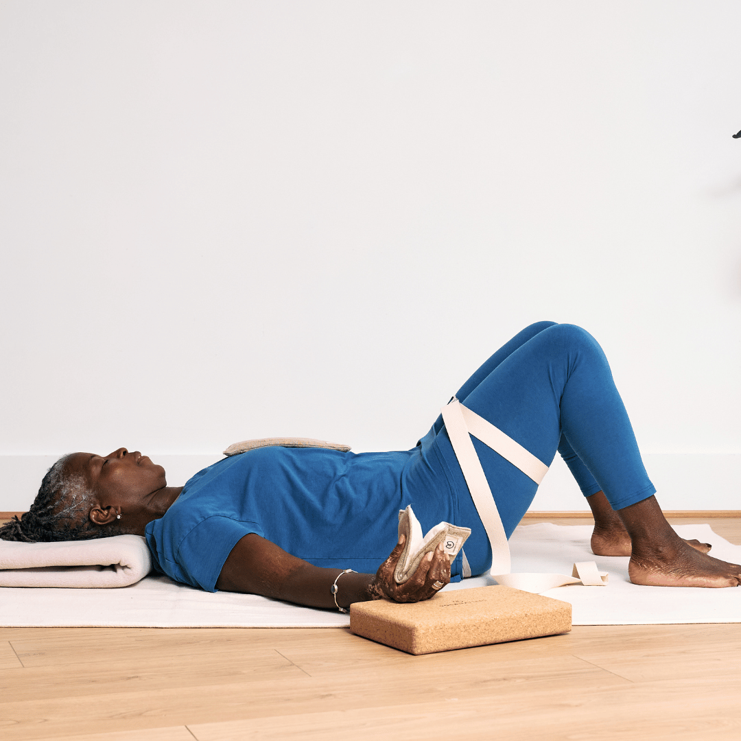 Lay one blanket widthways over your mat to create a layer of warmth. Fold the 2nd blanket to support the head and neck. Bend knees to lay back, bringing the yoga belt to mid thigh, ground feet with heels in line with hips toes facing forward. Lengthen tailbone towards heels, noticing the back body release into mat, relax thighs into the yoga strap. Draw shoulders down away from ears and the chin towards your chest. Place the eye pillow on your forehead, across your eyes or on your sternum. The eye pillows provide a gentle weight which is grounding in Restorative and when used across the eyes decreases light stimulation which is soothing for our nervous system. Place your arms wherever feels most comfortable, tune into your breath and dissolve into your posture.