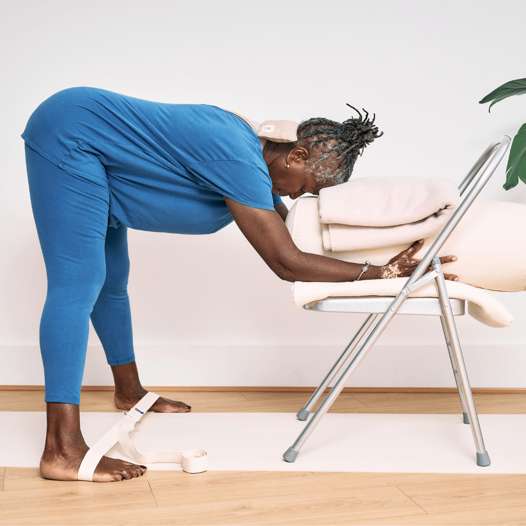 Keep chest lengthening forward as you reach arms onto chair seat, rest forehead on the folded edge of blanket keeping nose and mouth free. Neck spine should be flat with no curve, adjust your head support (Jenga moment) with foam block, folding blanket more or less. Find your comfort, then enjoy the calming sensation of forward fold and freeness of breath into the back body plus gentle opening to hamstrings.