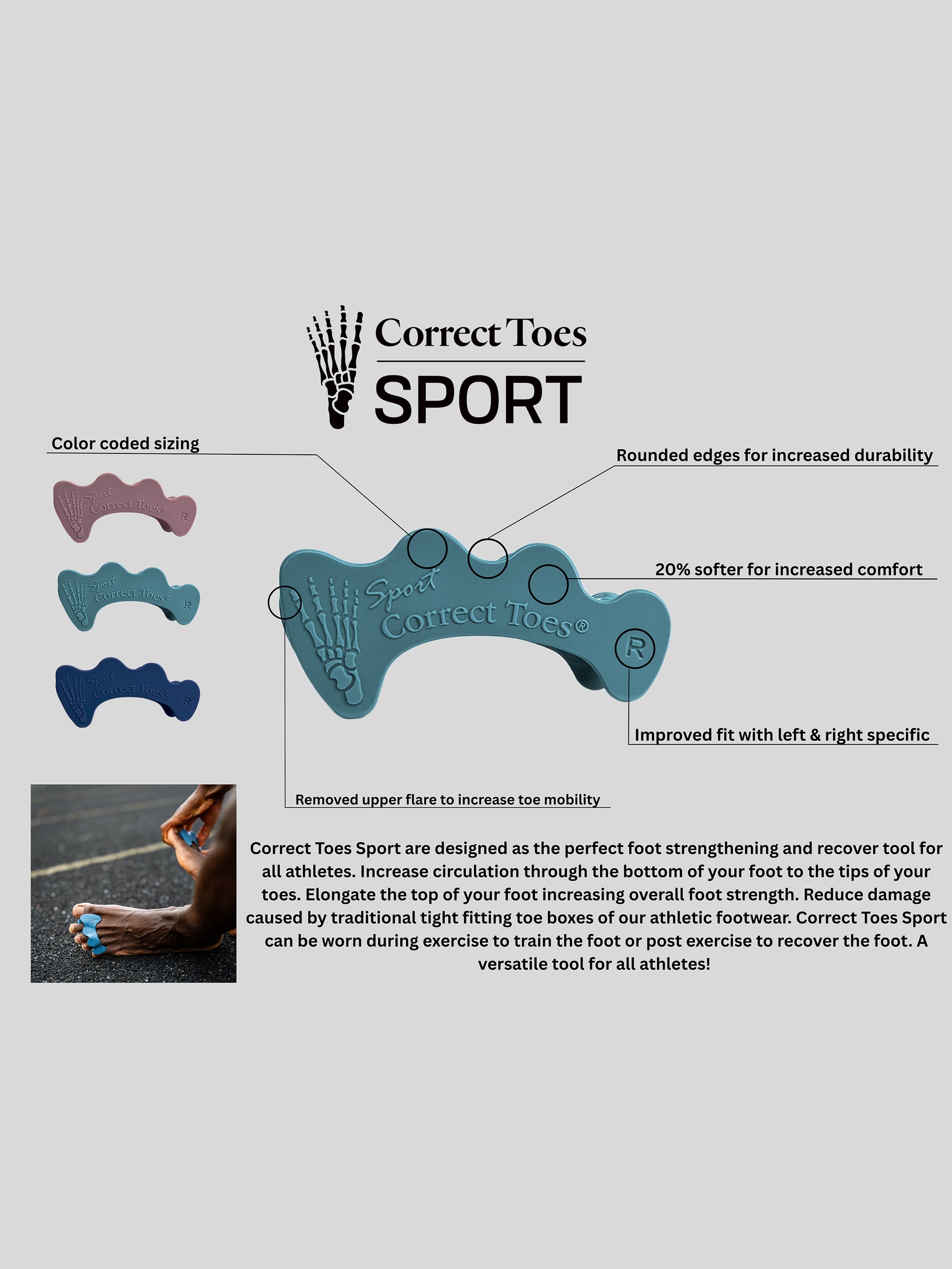 Correct Toes Sport are designed as the perfect foot strengthening and recovery tool for all athletes. You can benefit from increased circulation through the bottom of your foot to the tips of your toes. They elongate the top of your foot increasing overall foot strength and reduce damage caused by traditional tight fitting toe boxes of our athletic footwear. Correct Toes Sport can be worn during exercise to train the foot or post exercise to recover the foot. A versatile tool for all athletes!
