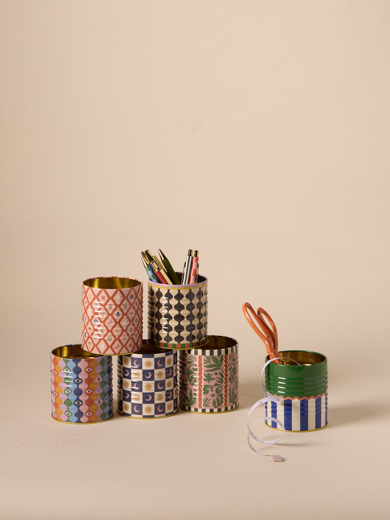 This printed tinplate storage tin is perfectly sized for keeping pens, pencils, scissors and other stationery supplies neatly organised whilst adding colour and pattern to your workspace.