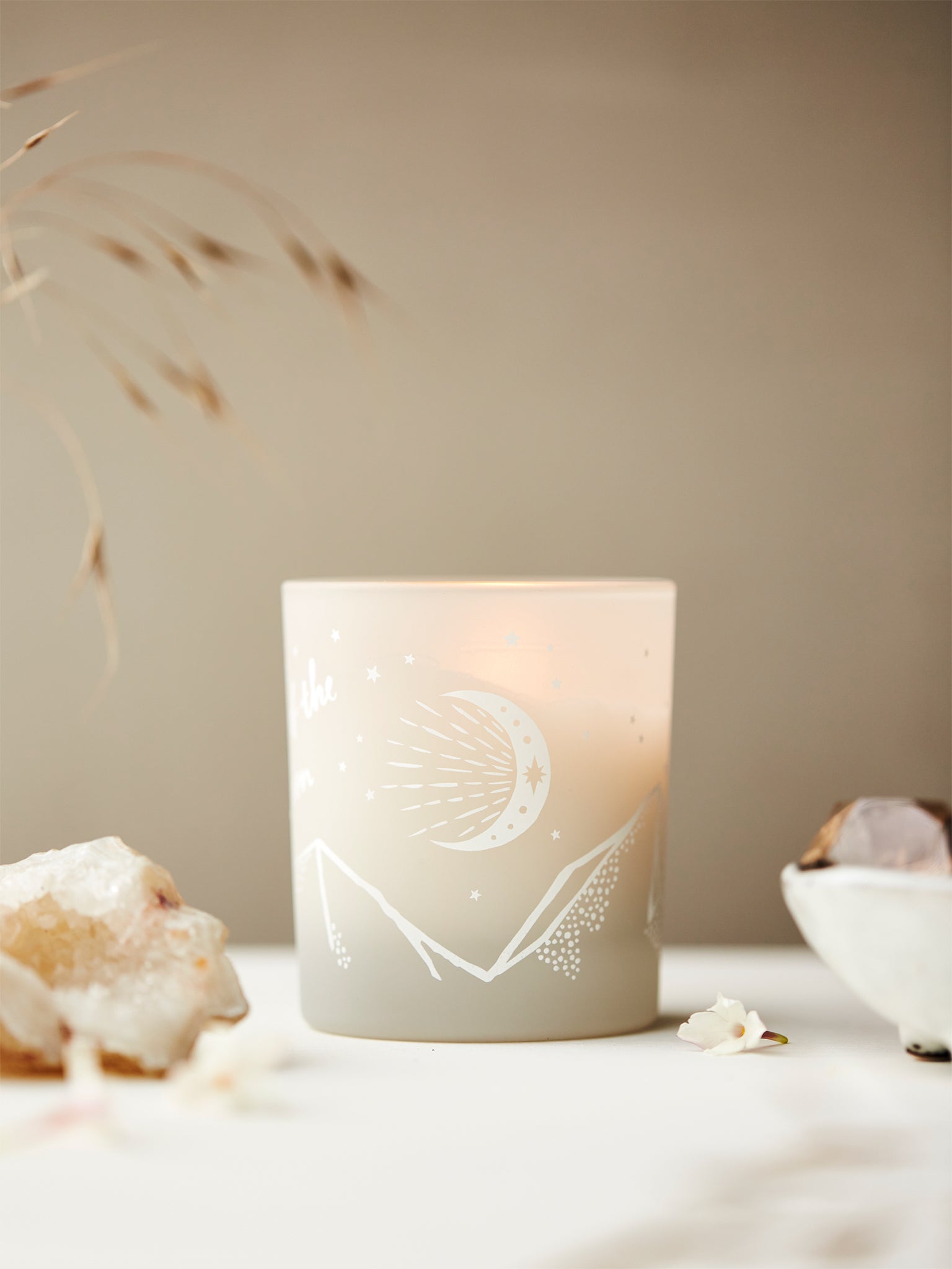 The Moon, stars and mountains are illustrated on the pale glassware, which illuminates when lit, creating beautiful shadows around the room.