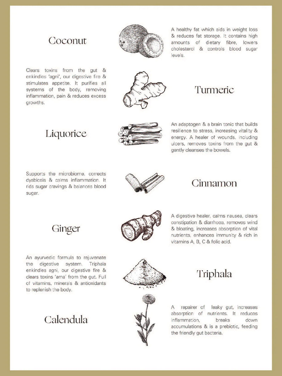 | Made From | Cocos Nucifera ~ Coconut Milk, Tapioca, Acacia Fibre, Curcuma Longa ~turmeric Root, Glycyrrhiza Glabra ~ Liquorice Root, Cinnamomum Zeylanicum ~ Cinnamon Bark, Zingiber Officinale ~ Ginger Root, Triphala ~ Amlaki (Phyllanthus Emblica), Bibhitaki (Terminal |