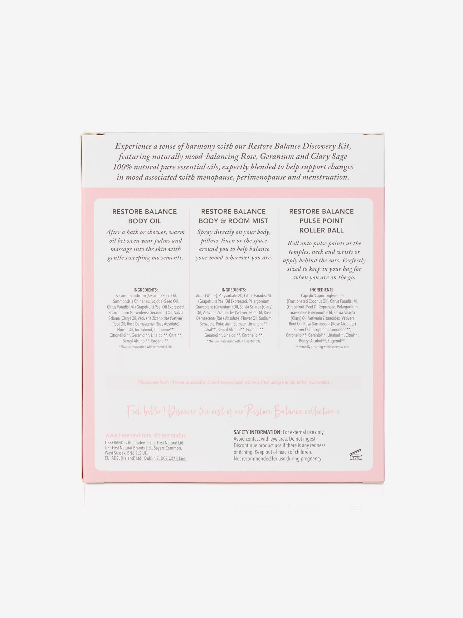Experience a sense of harmony with Tisserand's Restore Balance Discovery Kit, featuring naturally mood-balancing Rose, Geranium and Clary Sage, expertly blended to help support