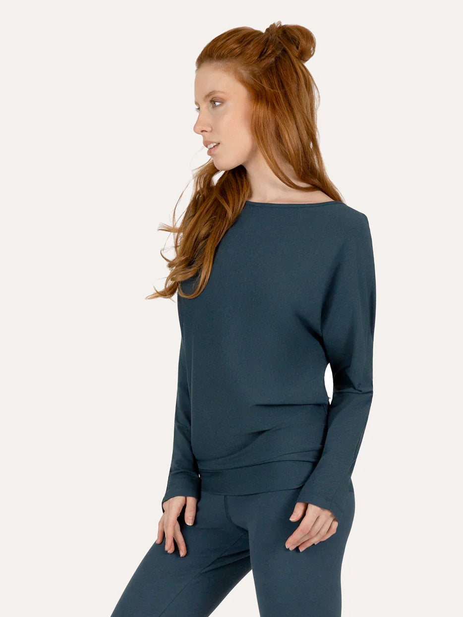 The Budhi long sleeve is that effortless piece you'll reach for again and again. With its elegant boat neckline, relaxed batwing sleeves, and soft waistband, this top combines comfort with a fit that stays perfectly in place—whether you're flowing, stretching, or simply being.