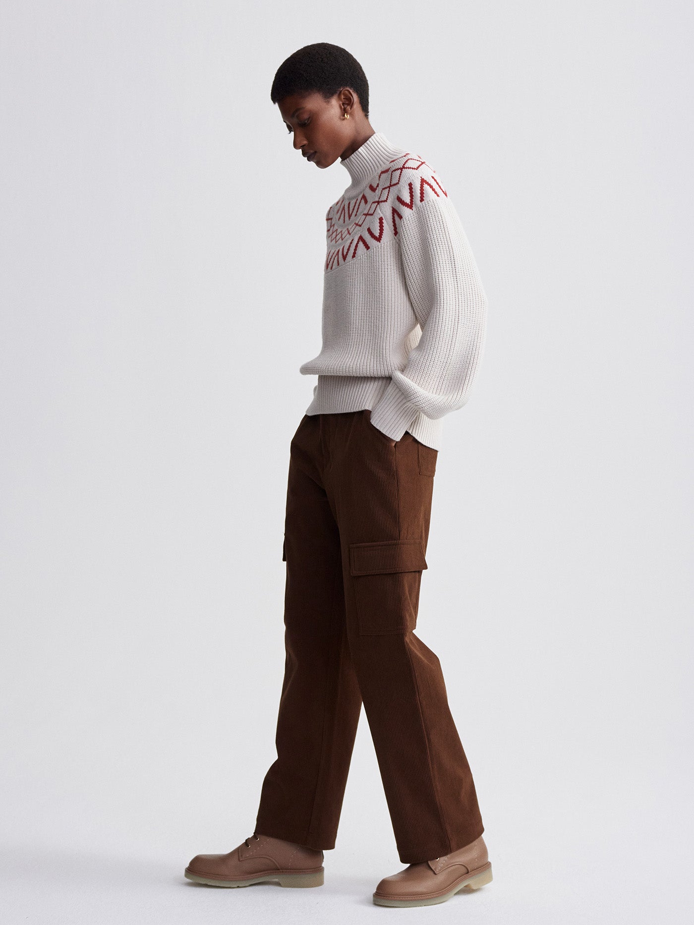 This piece boasts a relaxed fit, turtleneck, and chic balloon sleeves, complemented by an intricate all-over ribbed design and contemporary V monogram Fair Isle yoke. Complete the look by pairing the sweater with a Varley beanie for an effortlessly stylish ensemble.