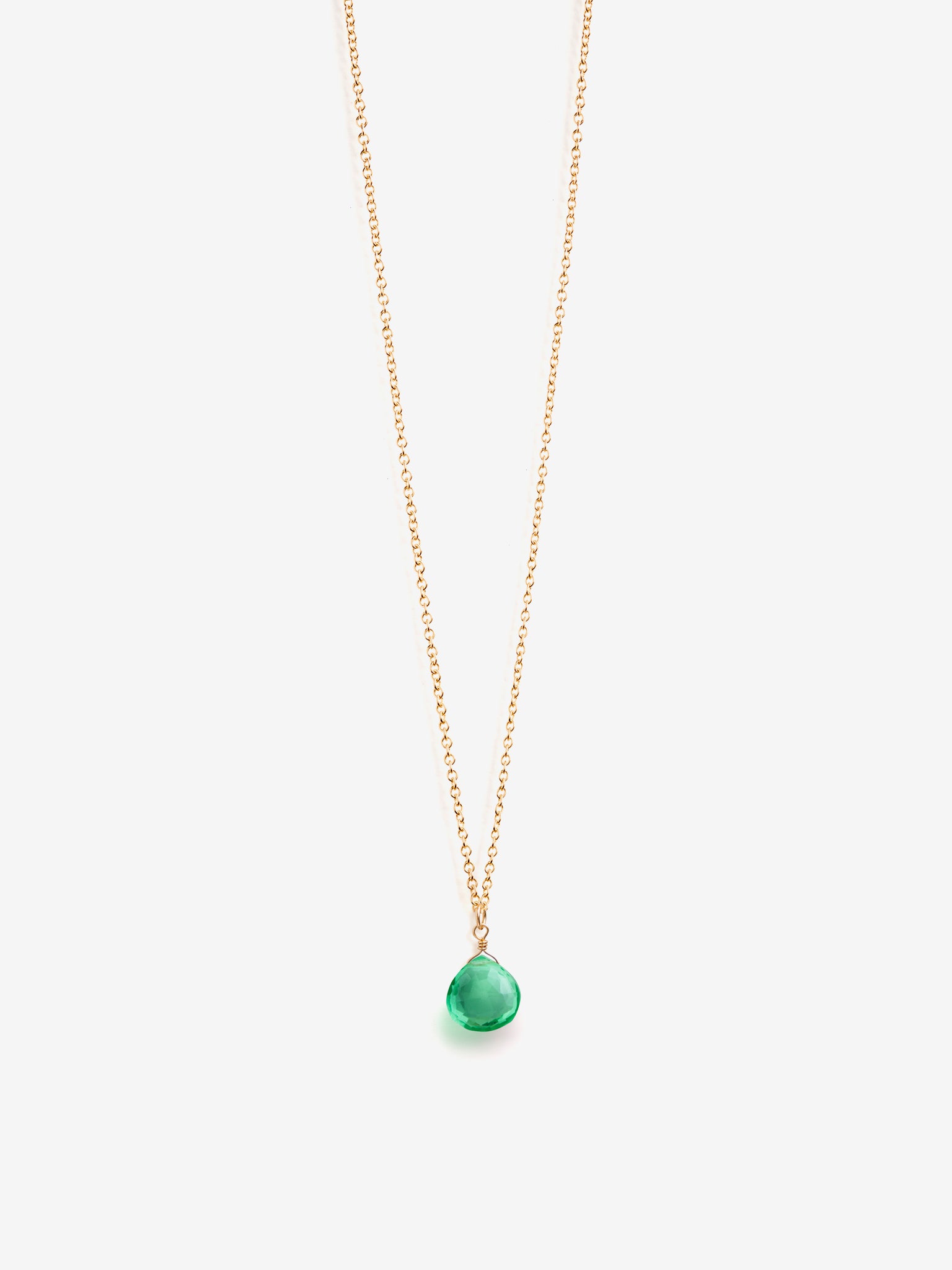 A quartz gemstone in Wanderlust Life's signature shape captures the delicate colour of seawater as it floats on a fine gold chain.