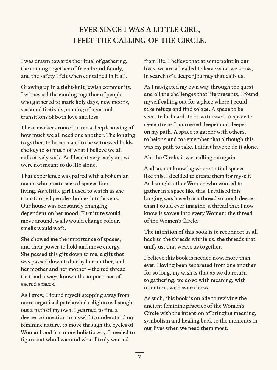 Beautifully illustrated with full-color photography, The Women's Circle is a practical and inspiring guide to hosting circles of your own. Including the history of circles, the importance of gathering, and steps for hosting 35 different rituals with the women in your life; a bridal blessing, mamahood blessing, memorial circle, new love circle, grief circle, sun circles, moon circles and circles to honor the change of season.
